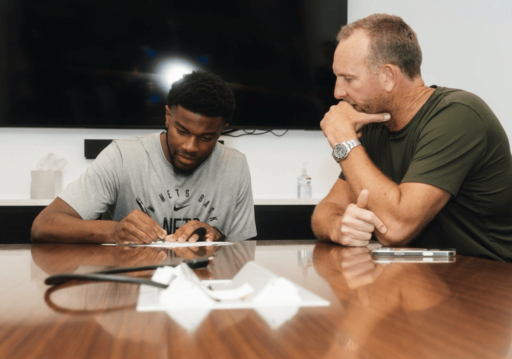 今日,籃網(wǎng)社媒曬出EJ-利德爾的板讓合同簽約現(xiàn)場照片,并配文: