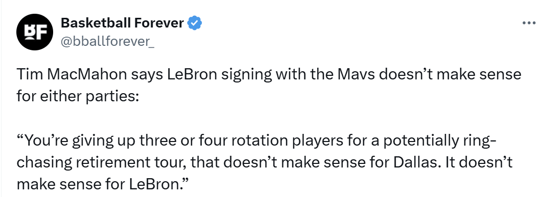 MacMahon表示,勒布朗加盟獨(dú)行俠對(duì)雙方都沒(méi)有意義: