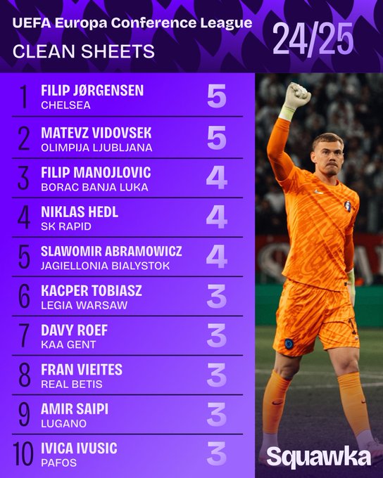 據(jù)Squawka數(shù)據(jù)統(tǒng)計(jì),在本賽季歐協(xié)聯(lián)門將零封榜中,板本并列切爾西門將約根森以5場零封并列第一。賽季森場
