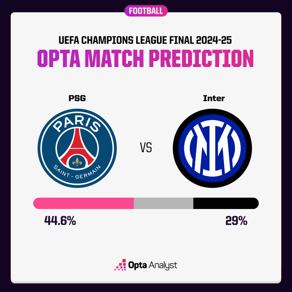 據(jù)Opta超級(jí)計(jì)算機(jī)對(duì)這場(chǎng)比賽進(jìn)行的1萬(wàn)次模擬,巴黎圣日耳曼在90分鐘內(nèi)取勝的概率為44.6%,而國(guó)際米蘭為29%,剩余26.4%的模擬,預(yù)測(cè)比賽將進(jìn)入加時(shí)甚至點(diǎn)球大戰(zhàn)。