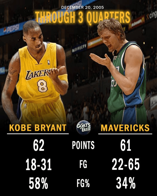 2005年12月20日,節(jié)比湖人與小牛的分超常規(guī)賽,科比-布萊恩特3節(jié)比賽31中18砍下62分,過整個球而小牛全隊總得分僅61分。板媒