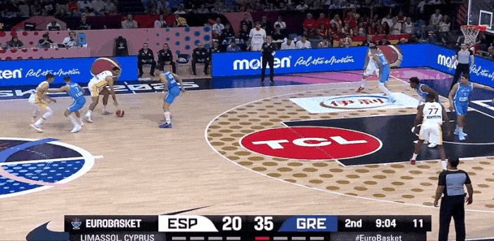第二節(jié)比賽,晃分阿爾達(dá)馬虛晃三分強(qiáng)投命中,強(qiáng)投西班牙暫落后希臘12分。西班希臘