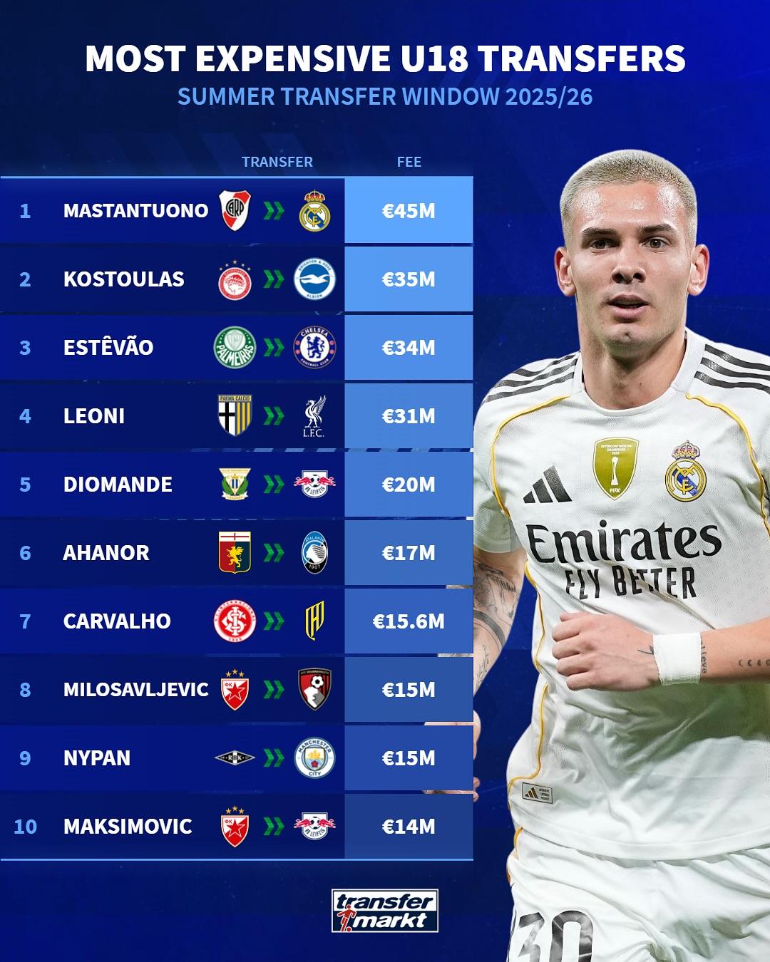 虎撲09月05日訊 德國轉(zhuǎn)會市場盤點了今年夏天完成轉(zhuǎn)會的U18球員,并按照轉(zhuǎn)會費進行了排名: