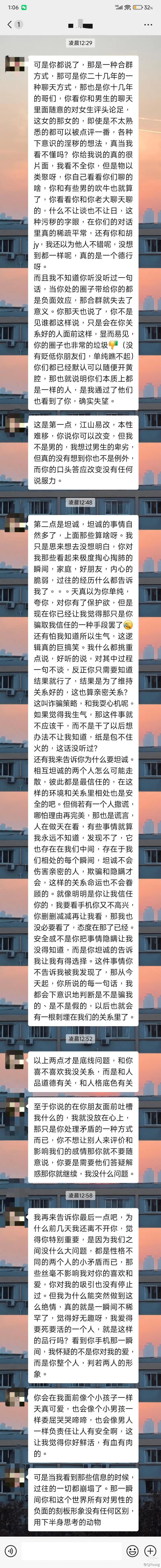 各位大哥們,先大概講一下情況。小弟今年大二,剛談了個女朋友,521時候才表白和人家在一起,這才沒幾天。前天和女朋友在圖書館學習,學到一半我先去食堂吃飯了,手機放在桌子上沒有拿著,結果被女朋友看了,吃完飯回來就發(fā)現(xiàn)不對勁了,女朋友臉拉的多長,最后在詢問下得知,女朋友是看了我和好兄弟們的聊天記錄,和好兄弟們都是認識將近十年的了,然后聊天內容可能也比較粗俗,口無遮攔的,會開黃腔什么的。女朋友覺得我在她面前表現(xiàn)出來的,并不是真實的我,覺得我虛偽偽裝。然后昨天已經(jīng)哄得差不多了,結果晚上又要看,我就先大概翻閱了一下記錄,刪了幾條那種說的很過分的話,被她看到了,結果她扭頭就走,說分手吧,我昨天晚上也哄了好久,結果她好像已經(jīng)下定決心了,大哥們,小弟現(xiàn)在該怎么辦。下面是她昨天回復我的話