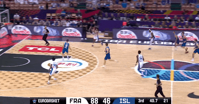 第三節(jié)比賽中,扣法庫(kù)利巴利墊步起飛空接飛扣,國(guó)節(jié)法國(guó)三節(jié)90-46領(lǐng)先冰島。流言利巴利墊