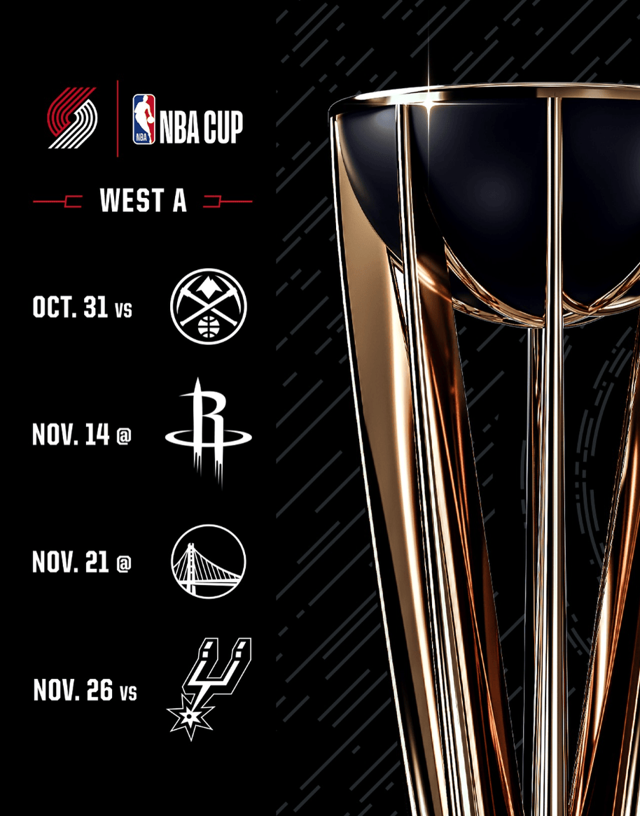 虎撲08月14日訊 開(kāi)拓者今日官方更新Instagram,他們公布了2025-26賽季球隊(duì)參加NBA杯賽的程分賽程,開(kāi)拓者所在小組對(duì)手分別是陣掘掘金、火箭、士和勇士和馬刺,馬刺具體賽程如下(北京時(shí)間):