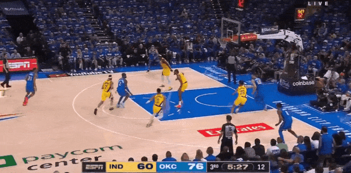 第三節(jié)比賽中,流言魯索卡魯索、威金威金斯各自投進(jìn)三記三分,斯各上雙雷霆已經(jīng)五人得分上雙。自投