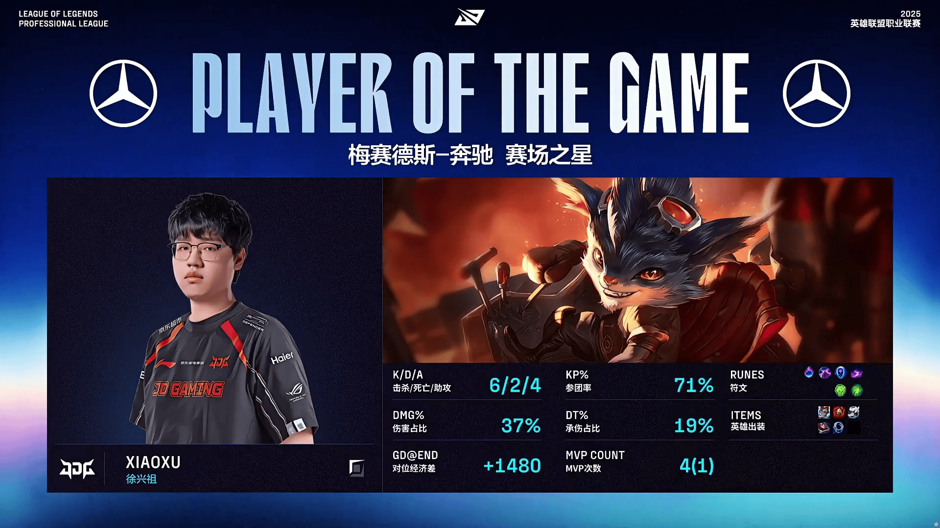虎撲09月07日訊 在剛剛結(jié)束的LPL季后賽的比賽中,Xiaoxu蘭博砍下6/2/4的首局戰(zhàn)績(jī),拿下JDG對(duì)陣BLG首局MVP